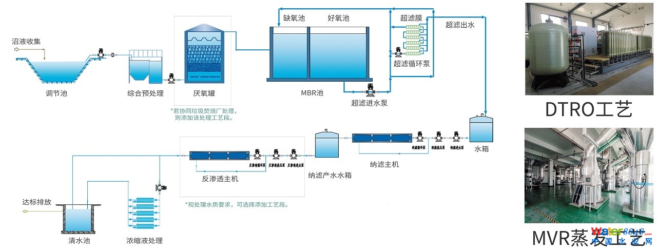 技術(shù)工藝:預(yù)處理→ 厭氧 →MBR→NF →  RO →濃縮液處理→達(dá)標(biāo)排放