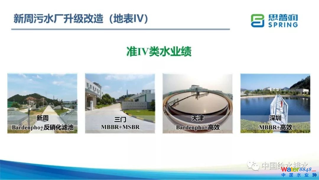 準IV類主要提幾個業(yè)績,李村河污水廠。雖然是按照一級A進行設計,但是已經(jīng)考慮到了后續(xù)的提標。我們進行了池容的開發(fā),從原來的好氧池需要推流器的循環(huán)流動池型到微動力混合池型,可以節(jié)約將近10%的能耗。微動力混合池型作為我們的技術升級目前也已經(jīng)用于一百多萬噸水的處理過程,該池型流化狀態(tài)非常好,沒有填料堆積的情況發(fā)生。寧波新周是我們準IV類水的業(yè)績。新周污水廠是半地下的污水廠,主要難點就是TN要降低至10mg/L,我們延續(xù)了李村河的技術路線,將氮磷指標都壓到生化段,深度處理保障相應指標的去除。在正常不加碳源的時候,整個夏季的時候TN是能夠完全達到10mg/L的,而冬季會略微超了一點,通過投加碳源后可以達標。這個是對比連續(xù)兩年的改造效果。我們的準IV類業(yè)績包括新周、三門、天津和深圳。現(xiàn)在已經(jīng)做了將近10例,積累了大量的經(jīng)驗。我們在面對準IV類的時候,通過微動力混合池型,SND的加載以及Bardenpho和MBBR的整合形成了我們MBBR+的技術,共同助力準IV類水的提標。