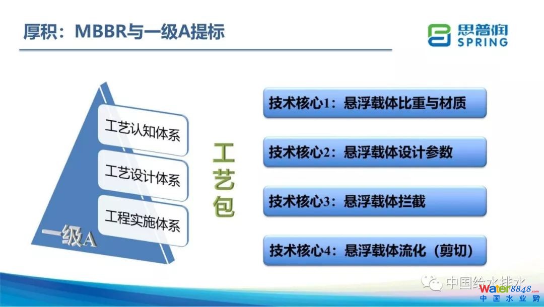 對于一級A的改造,在2015年思普潤就已經(jīng)積累了80項工程案例,500萬噸水質(zhì)。涵蓋了各類池型的改造,積累了豐富的經(jīng)驗;仡櫼患堿的改造,實際上是從我們先開始工藝實施,建立設計體系,然后再更深入的理解工藝,知道了MBBR的技術核心在于懸浮載體比重和材質(zhì)、懸浮載體設計參數(shù)、懸浮載體的攔截和懸浮載體的流化。并且確定了思普潤MBBR工藝包。