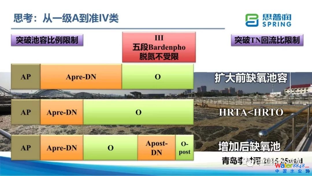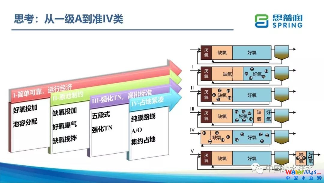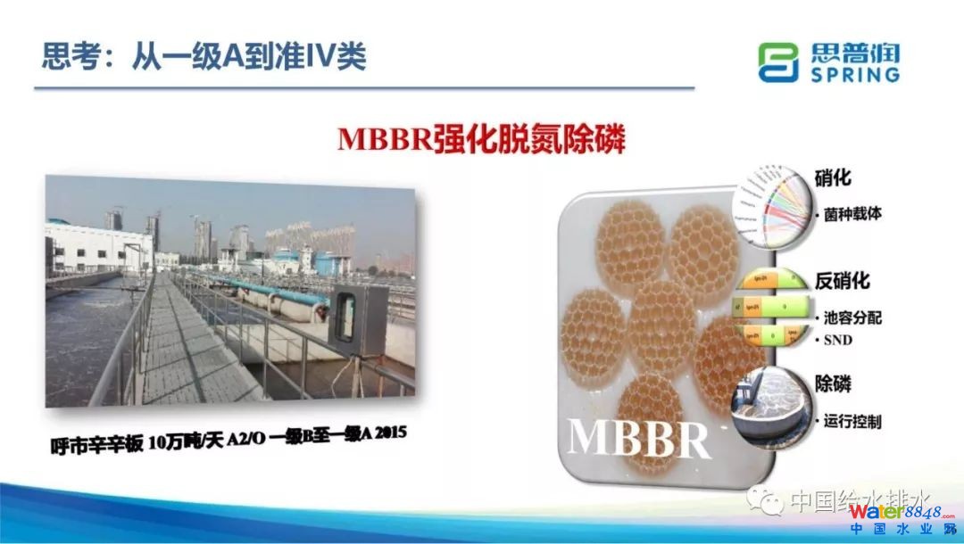 經(jīng)過我們在一級A的眾多實踐,我們形成了5條升級改造的技術路線,也基本上是MBBR改造大家都認可的一個標準。從一級A到準IV類,我們可以明顯的看到,我們一級A的時候是靠工程來驅動的,而到準IV類則是從我們技術研發(fā)來驅動,通過我們對一級A案例的不斷回訪和優(yōu)化,總結經(jīng)驗歸納設計,與業(yè)主共同進行MBBR工藝的二次開發(fā)。