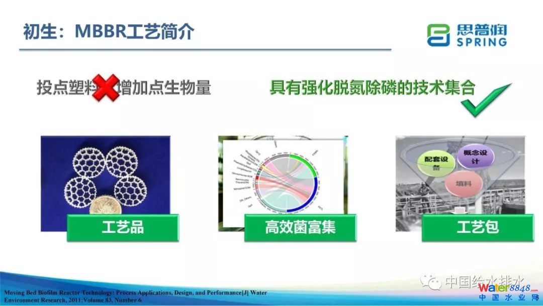 多數(shù)人對于MBBR的直觀理解就是投點塑料增加點生物量,但是隨著我們十多年來的研究,MBBR填料我們認為是工藝品,能夠高效富集菌群,是包括填料、配套設備、概念設計的工藝包,具有強化脫氮除磷的技術集合。