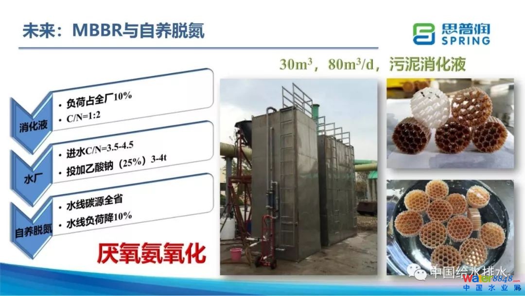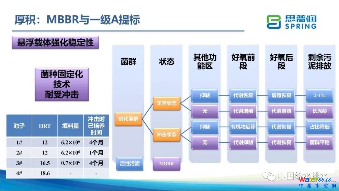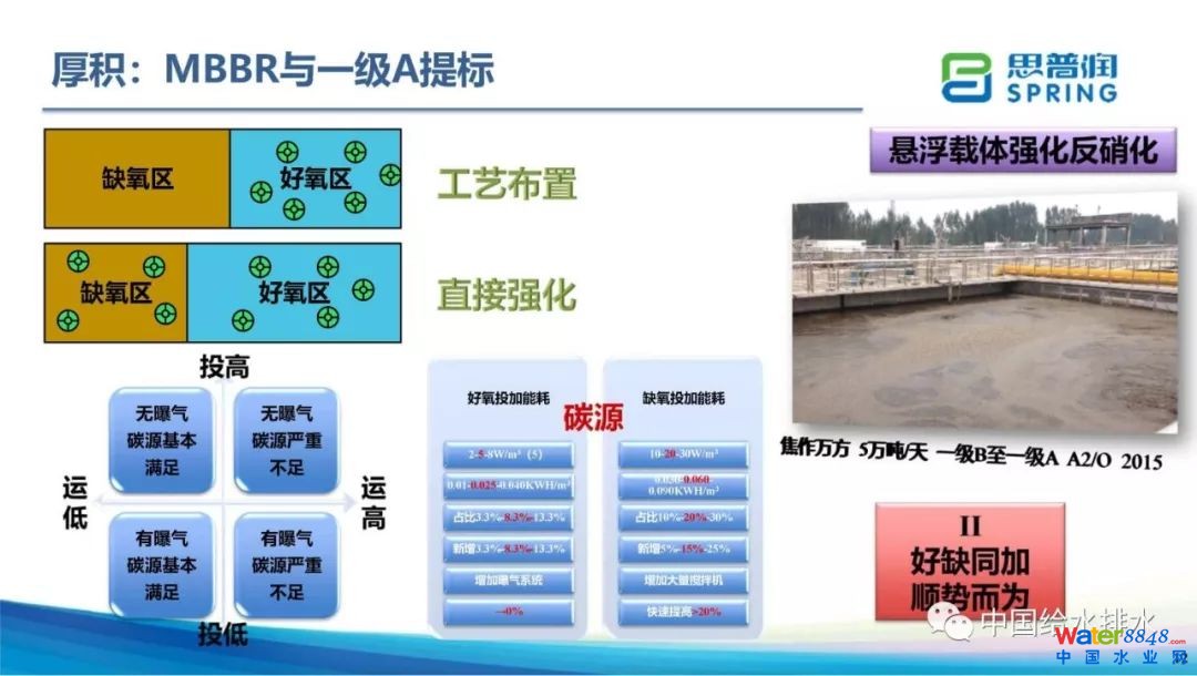 整體而言,剛才我說MBBR可以同步脫氮除磷,強化硝化反硝化大家可能還有疑問。實際上,MBBR對于硝化或者反硝化是通過直接富集菌種,對于反硝化的強化要不直接投加在缺氧段,要么通過池容的分配來擴大缺氧區(qū),再一個就是SND,助力TN的去除效果的提升。對于除磷,一方面是可以縮短泥齡,再一個反硝化的徹底也為除磷提供了良好的條件。