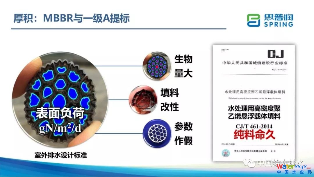 在我們MBBR工藝的改造過程中,我們逐步形成了一個共識,MBBR的處理效果是和比表面積息息相關的,這個理念也是得當了國內(nèi)行業(yè)內(nèi)的廣泛認同,新修訂的室外排水規(guī)范,也是把表面負荷作為了設計參數(shù)。從表面負荷的概念我們還要引起三方面的警惕:第一就是懸浮載體是不是應該強調(diào)生物量更多,這個概念顯然是荒謬的,因為我們關注的是它的比表面積而不是生物量,并且懸浮載體主要是富集自養(yǎng)菌硝化細菌,其比生長速率低,自然也不會有很大的生物量;第二就是填料改性,其實這個理念也是為了富集更大的生物量,實際上在表面負荷的設計理念下,這些都不是科學的;第三個就是參數(shù)作假,以比較低的有效比表面積來冒充高的。我們在2014年的時候出臺了行業(yè)標準,來規(guī)范市場行為,行業(yè)標準里面也針對MBBR的參數(shù)做出來明確的界定,防止造假,里面有各類不同類型的填料的有效比表面積。并且我們在工程應用中發(fā)現(xiàn),采用純的高密度聚乙烯材料,其壽命更長久。