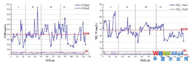 中試系統(tǒng)的COD、氨氮、TN、TP處理效果分述如下。整個系統(tǒng)運行期間,COD均值為26.00mg/L,去除率平均為93.52%,穩(wěn)定達到一級A。由于系統(tǒng)的懸浮填料取自水廠生化池填料,已掛膜成熟,系統(tǒng)開始運行后,氨氮處理效果穩(wěn)定達到一級A標準,且出水平均值僅為1.26mg/L,平均去除率為96.67%。