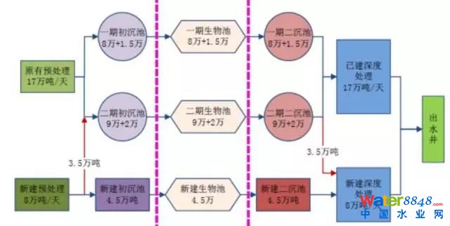 我們還借鑒了一個參照,就是了解到無錫蘆村污水處理廠提標改造之后效果挺不錯,而且從規(guī)模和生物處理工藝來說都跟我們比較相近。它采用的升級改造方案如下圖: