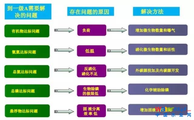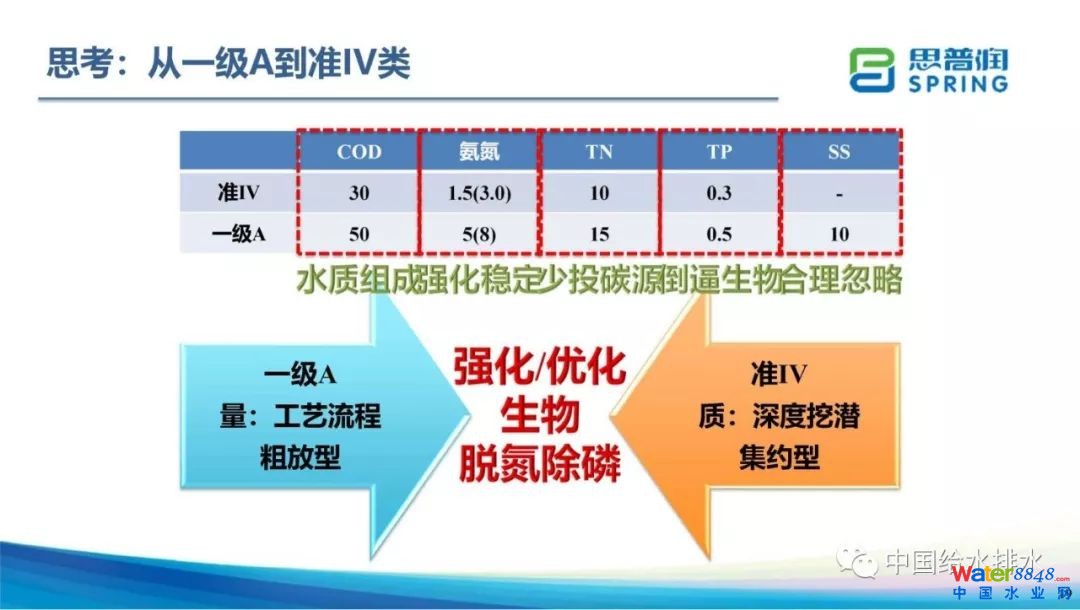 從一級A到準IV類我們有新的思考,COD完全是由水質(zhì)來決定的,水質(zhì)好自然30是沒有問題的;氨氮很多南方的水廠已經(jīng)能夠達到準IV類,但是不穩(wěn)定,很難完全穩(wěn)定的達到準IV類水;TN概況起來最簡單的就是碳源的問題,而我們的目標是如何能少投碳源;TP這么低的排放標準需要我們倒逼生化段,充分發(fā)揮生物除磷的作用;而SS很多準IV類的標準選擇性的忽略掉,沒有要求SS,這也是非常合理的,并且他對于自然水體的危害不大。所以從標準的變化倒逼了技術的強化和優(yōu)化生物脫氮除磷。對于一級A,許多構筑物包括深度處理的建設是一種粗放型的升級改造模式,而在準IV類,整個的工藝流程已經(jīng)布滿,所以倒逼我們把所以的工藝深度挖潛,尤其是生化工藝,要走集約型的工藝路線。我們對改造過的案例進行了進一步的分析和追蹤。
