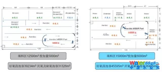 因此升級改造的時候,借鑒蘆村污水廠總工藝采用MBBR工藝,主要考慮保證低水溫情況下的總氮指標,通過增大缺氧池的容積,將好氧池部分容積改為缺氧池,好氧池不足部分通過MBBR去解決。在一期填料區(qū)是12500m 3,投加填料5000 m 3,好氧段池容39234 m 3,缺氧段池容31326m 3,二期基本相同,生物池填料區(qū)都采用加推流器的跑道型MBBR區(qū)。下圖就是生物池改造設計。