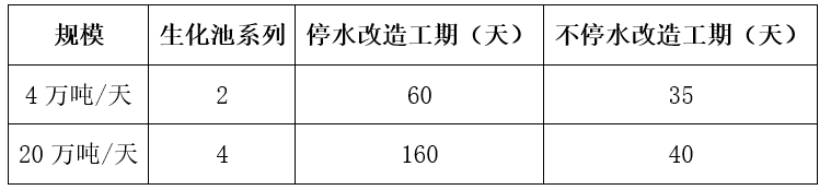 MBBR工藝不停水改造非但不會延長改造工期,反而會有效縮短改造工期。主要是因為 不停水改造實施無需新增土建、無清淤工作,多組生化池可以在正常運行的情況下同時進行工藝改造,生物池數(shù)量越多,不停水改造縮短工藝改造工期的優(yōu)勢越明顯。以20萬噸/天處理量的太原城南污水廠為例,4組生物池如果采用停水改造,改造工期在160天左右,而不停水改造的工期僅為40天。所以不停水改造不僅不會影響整體工期,而且還能確保工藝改造實施期間污水處理廠的正常運營和收入。