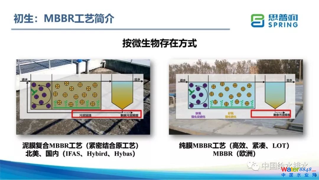 首先向大家介紹MBBR工藝,MBBR即移動床生物膜工藝,通過向反應器內(nèi)投加懸浮載體填料來強化處理效果。根據(jù)微生物的存在方式,主要分為泥膜工藝和純膜工藝。早起在歐洲主要為新建工程所以采用純膜工藝,不富集活性污泥,而在國內(nèi)以及北美推廣主要為升級改造,主要為活性污泥復合的形式,做成泥膜復合工藝,當然也有一些商業(yè)名稱,如IFAS、Hybird、Hybas。根據(jù)提供的動力來源分為在好氧段投加,通過曝氣作為動力來源,以及在缺氧區(qū)投加依靠攪拌作為動力來源兩種方式。