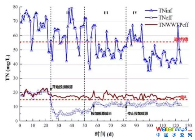 由于進水碳源不足,TN在不投加碳源時難以達標,第24-55d投加碳源,投加量為1.35kg/d乙酸鈉(相當于BOD為60mg/L),期間TN始終穩(wěn)定達標,且均值僅為6.20mg/L,去除率平均為89.67%,水廠同期出水TN均值為16.95mg/L。第53-81d投加碳源量為0.67kg/d乙酸鈉(相當于BOD為30mg/L),期間TN亦始終穩(wěn)定達標,且均值僅為11.66mg/L,水廠同期均值為17.46mg/L。