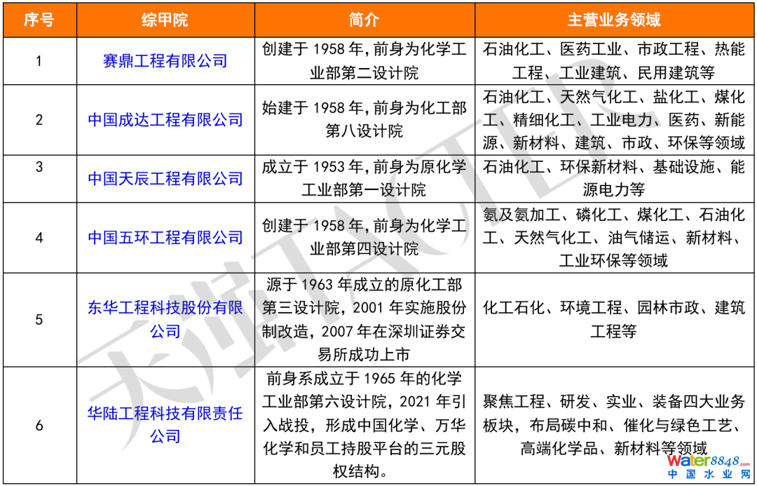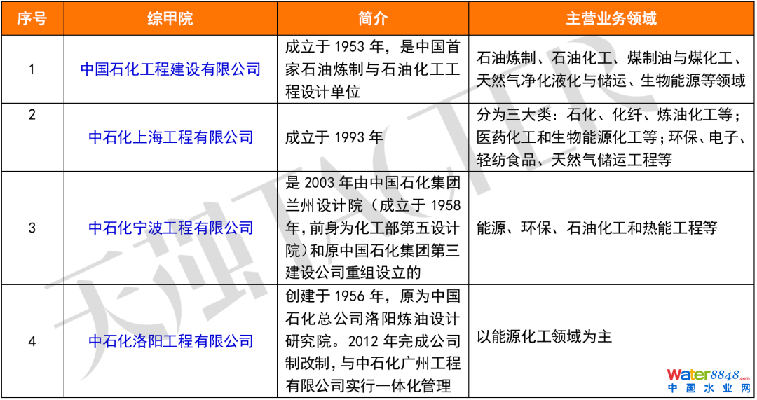 以下6家綜甲院,前4家為中國化學工程股份有限公司的全資子公司,后2家為中國化學工程股份有限公司的控股子公司。