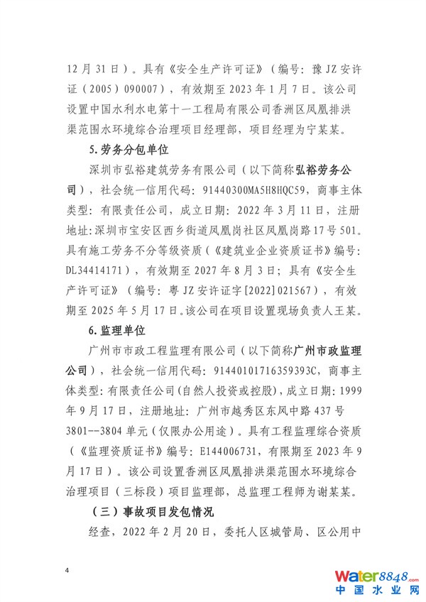 調(diào)查顯示,事故項(xiàng)目為珠海市香洲區(qū)鳳凰排洪渠范圍水環(huán)境綜合治理項(xiàng)目。涉事工程的施工單位為中國(guó)水利水電第十一工程局有限公司,項(xiàng)目經(jīng)理為寧某某。勞務(wù)分包單位為深圳市弘裕建筑勞務(wù)有限公司。監(jiān)理單位為廣州市市政工程監(jiān)理有限公司。