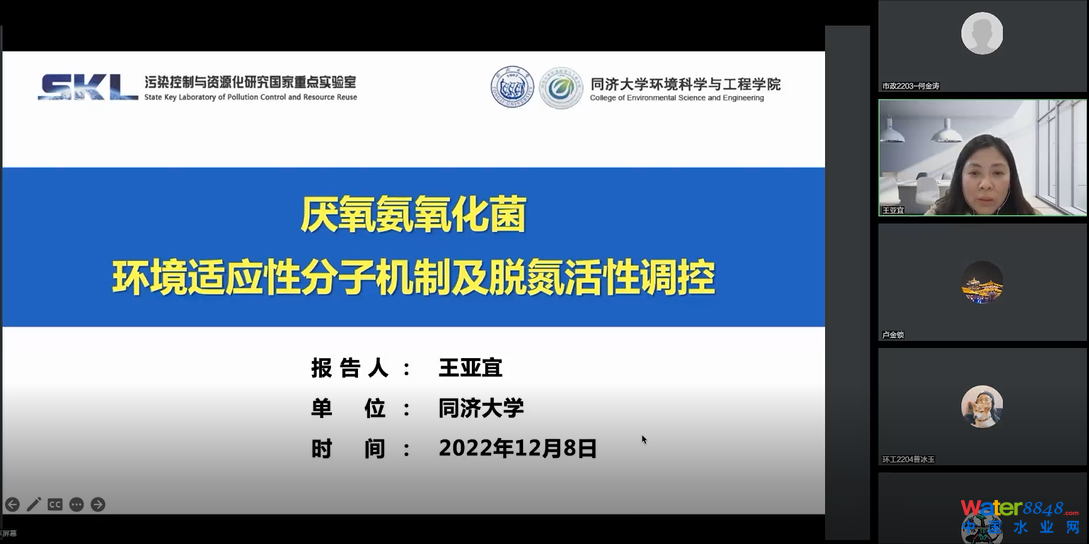 核心提示:環(huán)境大講堂第13期|王亞宜:厭氧氨氧化菌環(huán)境適應(yīng)性分子機(jī)制及脫氮活性調(diào)控 2022-12-12525 次 作者:劉澤,張睿 編輯:張璐 來源:研究生/科研辦 2022年12月9日下午,環(huán)境學(xué)院第13期環(huán)境大講堂活動(dòng)順利舉辦。本期講座特邀國家杰出青年基金獲得者、同濟(jì)大學(xué)環(huán)境科學(xué)與工程學(xué)院王亞宜教授于線上分享題為《厭氧氨氧化菌環(huán)境適應(yīng)性分子機(jī)制及脫氮活性調(diào)控》的學(xué)術(shù)報(bào)告。講座由環(huán)境學(xué)院院長盧金鎖教授主持,學(xué)院師生近300人與會交流。 會議伊始,盧金鎖對王亞宜教授的到來表示歡迎與感謝,并簡要介紹了其研