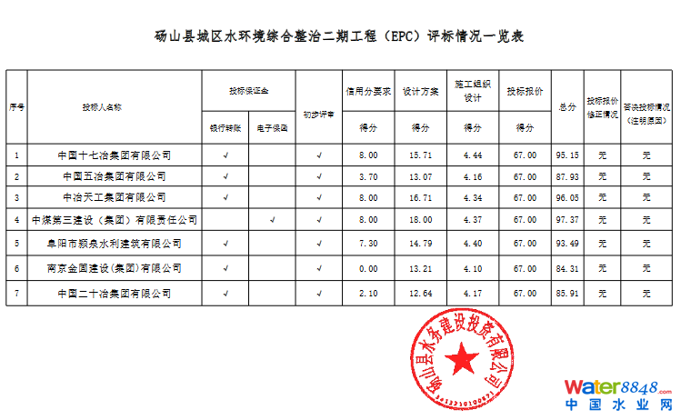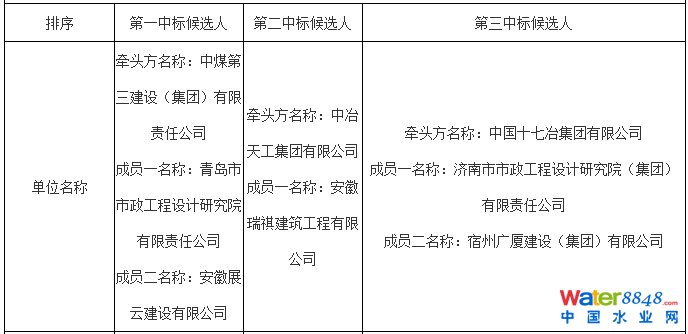 5月10日,宿州市公共資源交易中心發(fā)布碭山縣城區(qū)水環(huán)境綜合整治二期工程(EPC)中標(biāo)候選人公示,第一中標(biāo)候選人為中煤第三建設(shè)(集團)有限責(zé)任公司、青島市市政工程設(shè)計研究院有限責(zé)任公司、安徽展云建設(shè)有限公司聯(lián)合體。