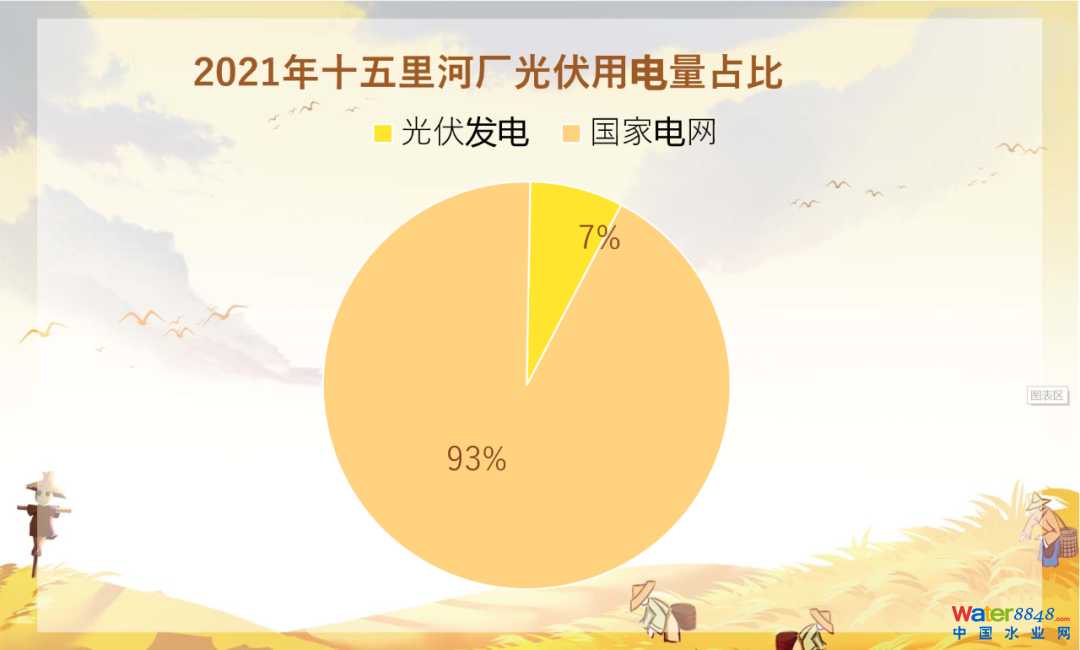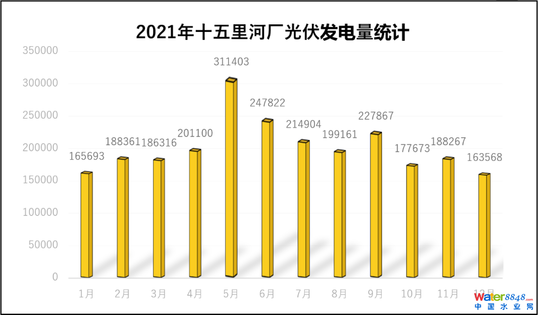 成效:十五里河分布式光伏發(fā)電項目2021年全年發(fā)電247.21萬度,其中峰時電量97.03萬度,平時電量142.01萬度,谷時電量8.17萬度,占廠區(qū)年總用電量7.61%,提升了污水廠能源自給比率,節(jié)省用電成本約25萬元,所產(chǎn)生的電能無二次污染,符合清潔生產(chǎn)的理念。