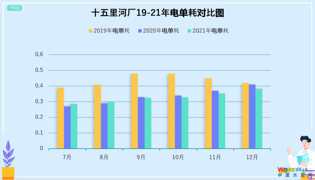 2019年至2021年全年噸水平均電耗分別為:0.420kWh/噸水、0.373kWh/噸水、0.364kWh/噸水,2021年電耗同比2019年下降約15%。
