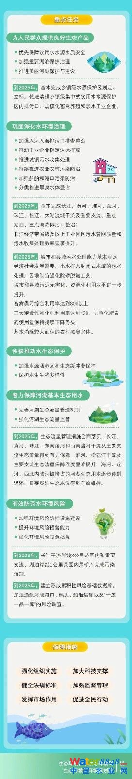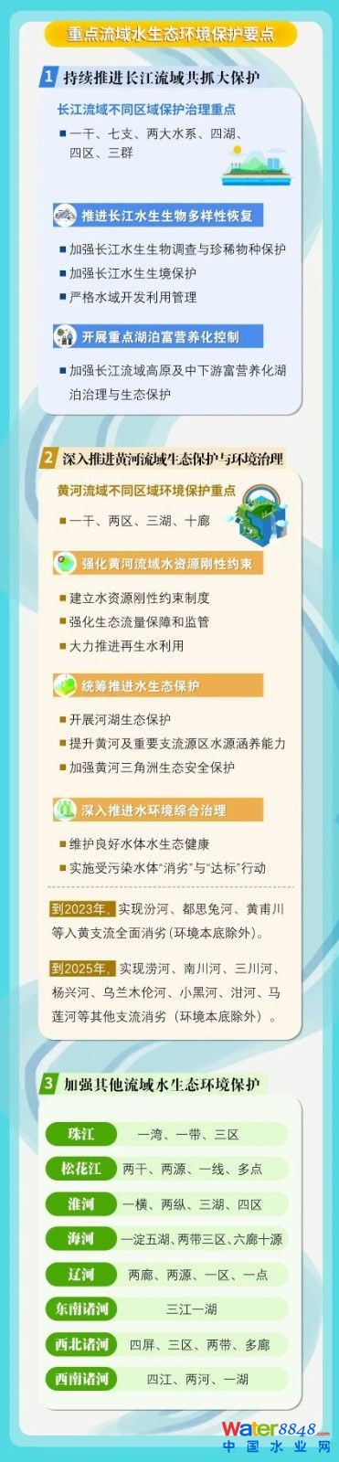 從生態(tài)環(huán)境部發(fā)布《規(guī)劃》圖示內(nèi)容(下圖所示)中可以看出,重點(diǎn)流域治理的主要任務(wù):到2025年,基本完成長(zhǎng)江、黃河、淮河、海河珠江、松遼、太湖流域干流及重要支流、重點(diǎn)湖泊、重點(diǎn)海灣排污口整治)長(zhǎng)江經(jīng)濟(jì)帶省級(jí)及以上工業(yè)園區(qū)污水管網(wǎng)質(zhì)量和污水收集處理效率顯著提升;到2025年,城市和縣城污水處理能力基本滿足經(jīng)濟(jì)社會(huì)發(fā)展需要,出水排入封閉式水域的污水處理廠因地制宜強(qiáng)化除磷脫氮工藝城市和縣城污泥無(wú)害化、資源化利用水平進(jìn)一步提升,畜禽類污綜合利用率達(dá)到80%以上三大糧食作物化肥利用率達(dá)到43%,力爭(zhēng)化肥農(nóng)藥使用量保持持續(xù)下降勢(shì)頭;基本消除較大面積的農(nóng)村黑臭水體。