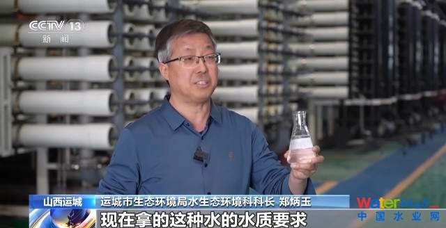 山西省運城市生態(tài)環(huán)境局水生態(tài)環(huán)境科科長 鄭炳玉:這些水現(xiàn)在再經(jīng)過進一步處理,也就是經(jīng)過我身后這些設備,經(jīng)過超濾反應的處理以后,就達到我手里面現(xiàn)在拿的這種水的水質(zhì)要求,這個水目前就達到地表水Ⅱ類水標準。