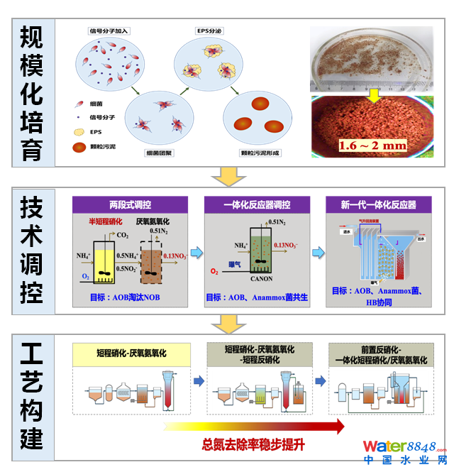 發(fā)明了多菌群協(xié)作優(yōu)化的脫氮功能菌群調(diào)控技術(shù),攻克了厭氧氨氧化快速啟動(dòng)和穩(wěn)定運(yùn)行難題。團(tuán)隊(duì)首創(chuàng)的AOB(氨氧化細(xì)菌)淘汰NOB(亞硝酸鹽氧化菌)半短程硝化調(diào)控技術(shù),使亞硝酸鹽積累率高達(dá)90%以上;發(fā)明了溶解氧控制下的菌群優(yōu)勢(shì)共生技術(shù),自主研發(fā)了新一代一體化厭氧氨氧化顆粒污泥反應(yīng)器,大大提高了總氮去除效率。