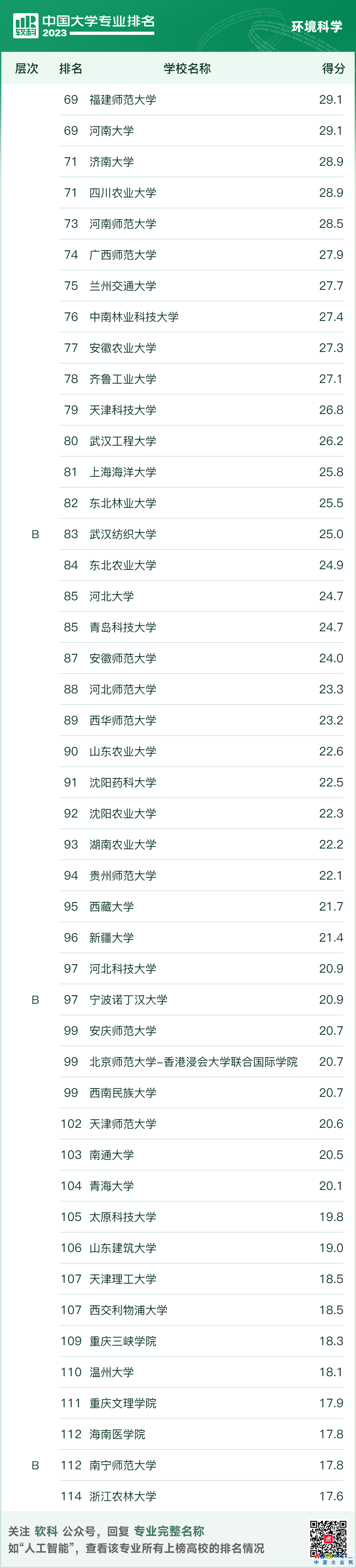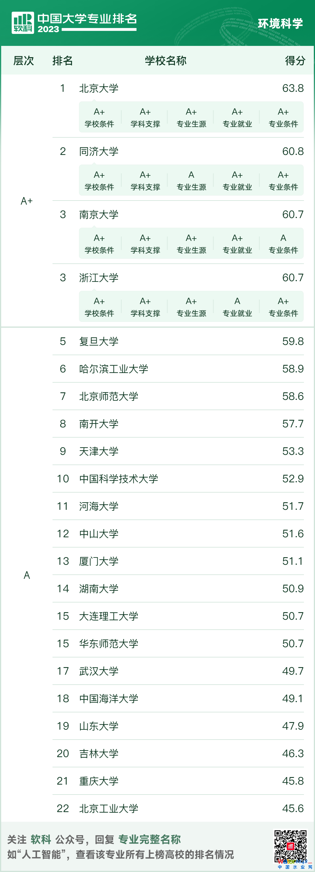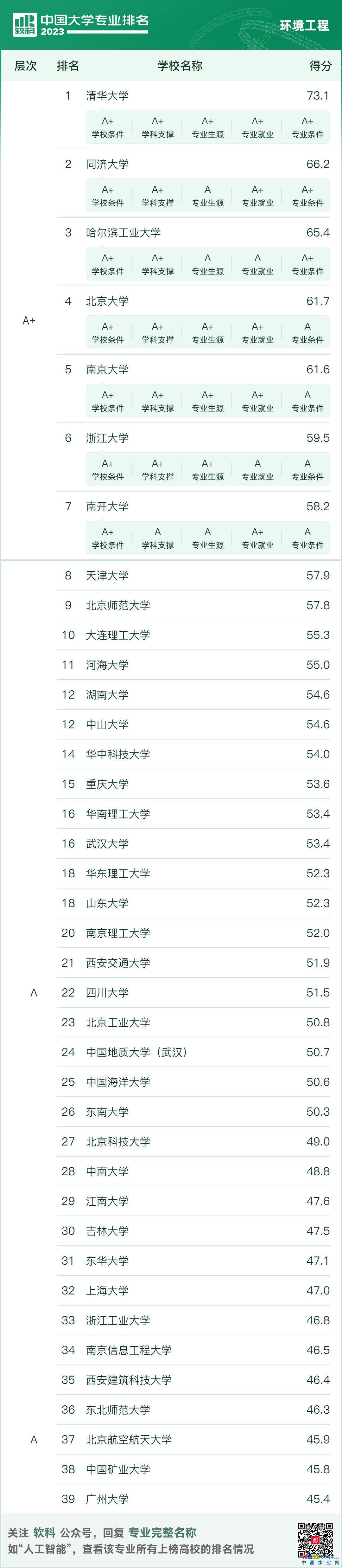 軟科中國大學專業(yè)排名新鮮出爐!8大環(huán)境學科排名一網(wǎng)打盡 時間:2023-06-19 10:19來源:軟科評論(0)分享 2023年6月15日,高等教育專業(yè)評價機構(gòu)軟科正式發(fā)布“2023軟科中國大學專業(yè)