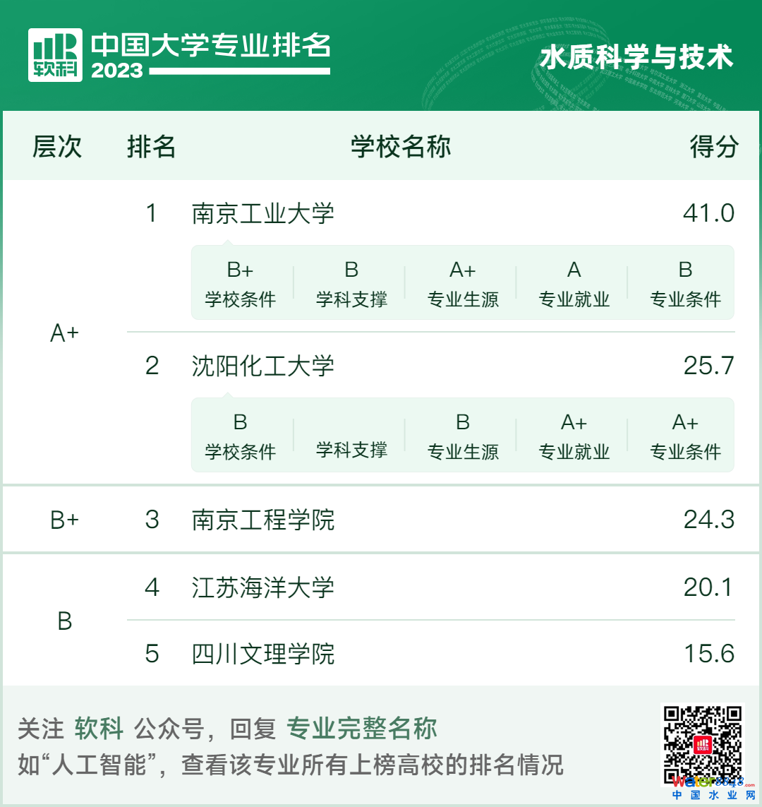 2023年6月15日,高等教育專業(yè)評價機構(gòu)軟科正式發(fā)布“2023軟科中國大學專業(yè)排名”。中國水網(wǎng)梳理環(huán)境科學與工程、環(huán)境工程、環(huán)境科學、環(huán)境生態(tài)工程、環(huán)保設(shè)備工程、資源環(huán)境科學、水質(zhì)科學與技術(shù)與給排水科學與工程共8個學科排名。