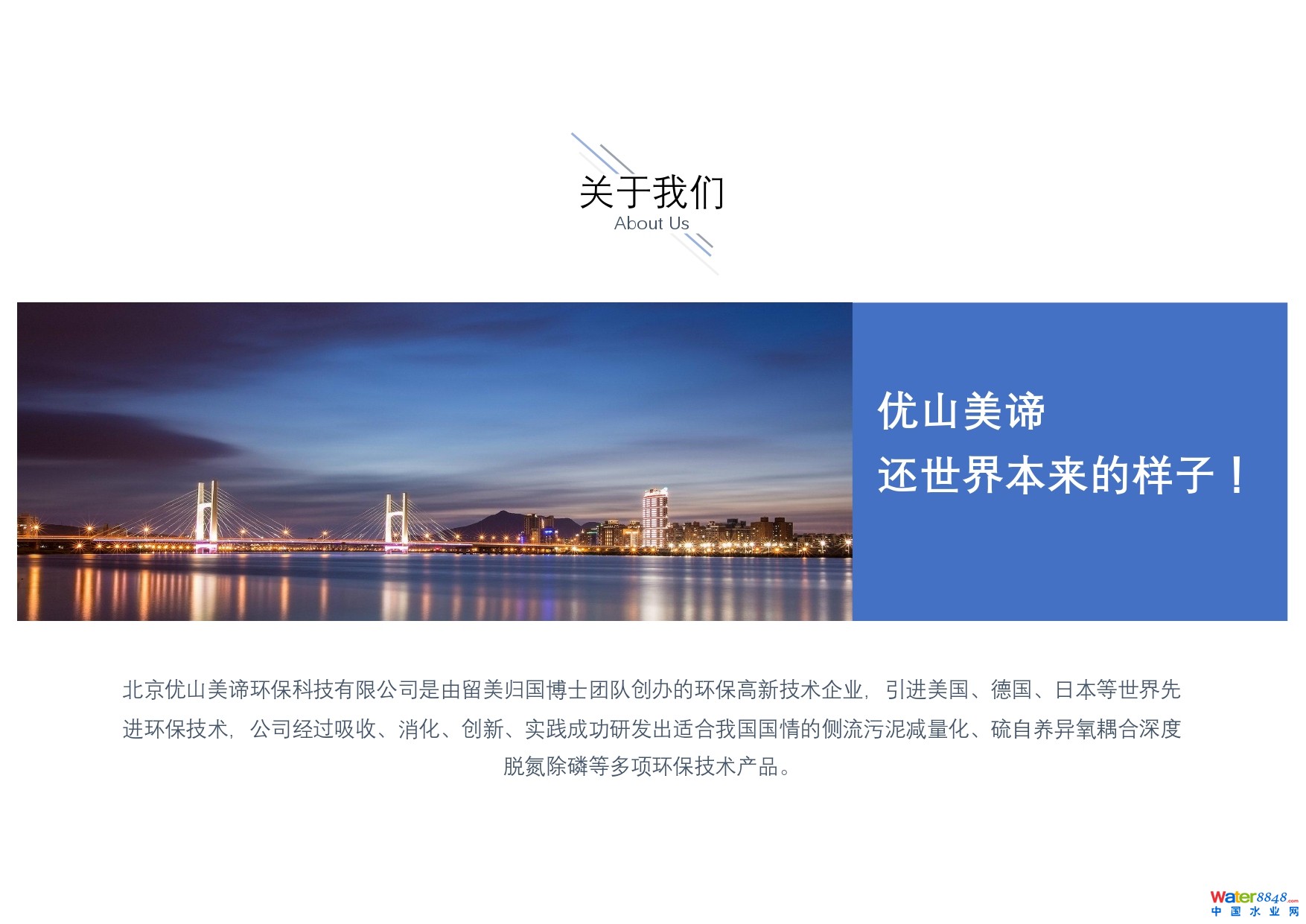 北京優(yōu)山美諦環(huán)保科技有限公司是由留美歸國(guó)博士團(tuán)隊(duì)創(chuàng)辦的環(huán)保高新技術(shù)企業(yè),引進(jìn)美國(guó)、德國(guó)、日本等世界先進(jìn)環(huán)保技術(shù),公司經(jīng)過吸收、消化、創(chuàng)新、實(shí)踐成功研發(fā)出適合我國(guó)國(guó)情的多項(xiàng)環(huán)保技術(shù)產(chǎn)品: l 側(cè)流污泥