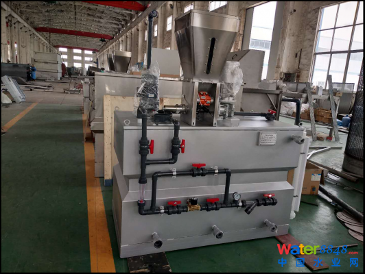 三腔式全自動加藥裝置是一個自動、連續(xù)式一體化的絮凝劑溶配及投藥裝置,濃度為0.1%-0.5%。本裝置由供水系統(tǒng)、干粉投加系統(tǒng)、溶解熟化系統(tǒng)、控制系統(tǒng)構成。