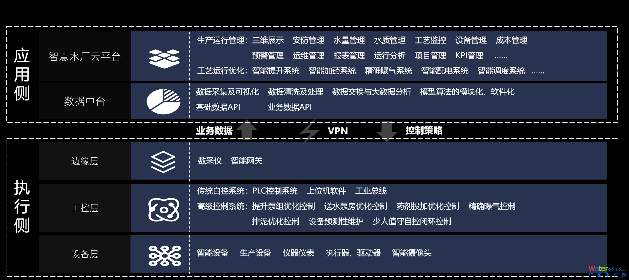 核心提示:解決方案 智慧水廠 發(fā)布時間:2021-10-08 15:52:08人氣:641 背景概述 2020年兩會工作報告中指出“加強(qiáng)污水、垃圾處理設(shè)施建設(shè)是提高生態(tài)環(huán)境治理成效的重要舉措”!靶禄A(chǔ)設(shè)施”的快速發(fā)展讓水廠智慧化轉(zhuǎn)型使上了快通車。 從工業(yè)1.0到工業(yè)4.0,工廠逐步通過技術(shù)創(chuàng)新不斷提高生產(chǎn)力,實現(xiàn)了從工業(yè)化、電氣化到自動化再到智慧化的發(fā)展。 德國水工業(yè)協(xié)會的《Water 4.0》認(rèn)為水行業(yè)和工業(yè)4.0一樣也進(jìn)入了水4.0時代,具有相同的發(fā)展需求和技術(shù)應(yīng)用,并明確提出了現(xiàn)階段智慧水務(wù)建設(shè)