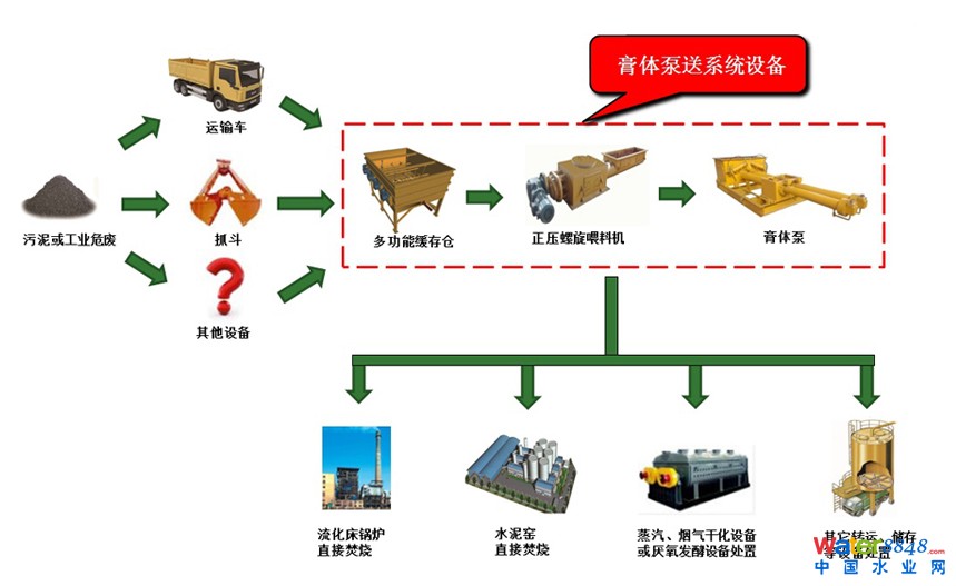 污水處理廠、造紙廠、PVC廠、印染廠等企業(yè)每年都會都會產(chǎn)生大量的市政污泥、造紙污泥、電石泥、印染污泥等粘稠固體廢棄物,通過車輛或其他設(shè)備運送至處置現(xiàn)場,經(jīng)緩存、輸送等工藝環(huán)節(jié)被直接送入現(xiàn)有的設(shè)施終端進行處置(直接焚燒、干化或轉(zhuǎn)運儲存)。