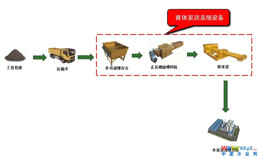 工業(yè)廢水污泥、化工油泥及其他膏體狀的工業(yè)危廢等通過外部設(shè)備運(yùn)送到膏體輸送系統(tǒng),先進(jìn)入攪拌緩存?zhèn)},再通過正壓螺旋給料機(jī)送至膏體泵,最后由膏體泵輸送至水泥窯進(jìn)行處理。