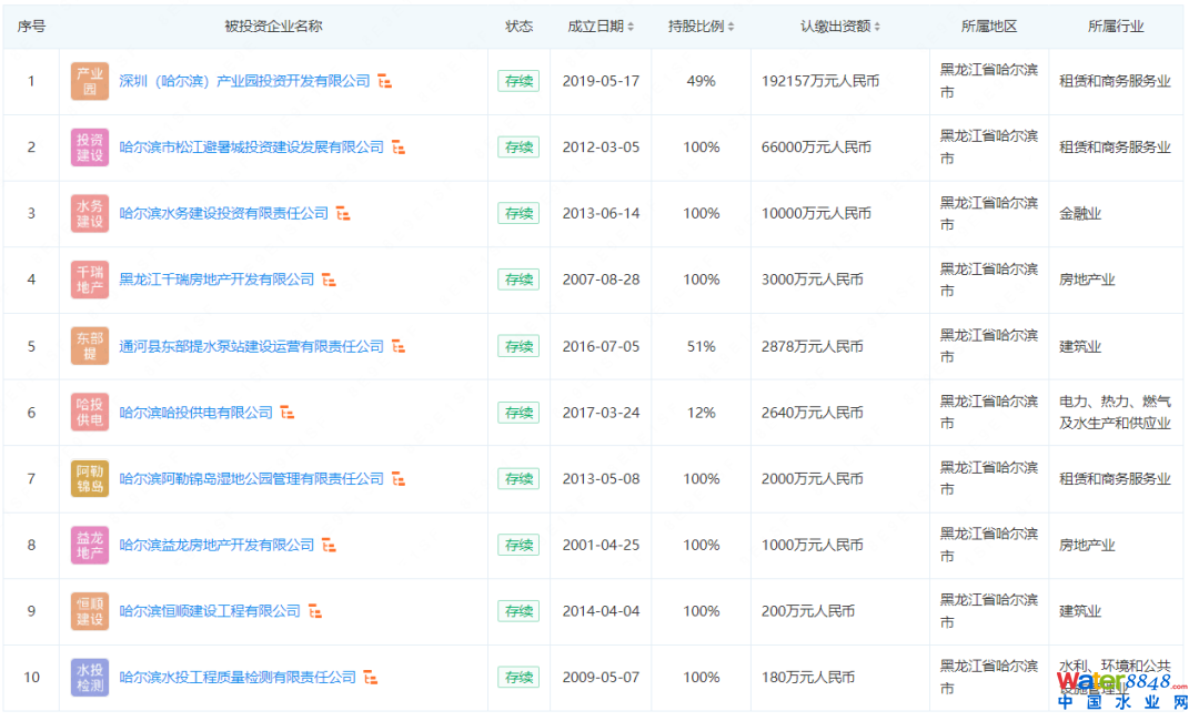據(jù)中國水網(wǎng)從企查查獲悉,目前哈爾濱水務(wù)投資集團(tuán)有限公司(以下簡稱“哈爾濱水務(wù)”)為哈爾濱市國資水務(wù)平臺(tái)公司,其名下目前有11家公司,從下圖中不難看出,哈爾濱水務(wù)目前干得活“比較雜”,房地產(chǎn)、租賃等業(yè)務(wù)也被劃入水務(wù)投資平臺(tái)中。