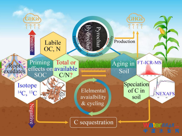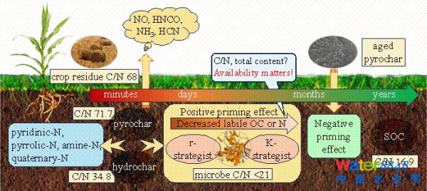 綜述論文厘清了生物炭(biochar)、熱解炭(pyrochar)和水熱炭(hydrochar)的定義內(nèi)涵;比較了熱解炭、水熱炭在土壤環(huán)境不同穩(wěn)定性及主控因素;探討了熱解炭和水熱炭誘導(dǎo)土壤有機(jī)碳分解的激發(fā)效應(yīng)作用機(jī)制等關(guān)鍵問(wèn)題。文章首次提出了土壤環(huán)境中有效態(tài)C/N化學(xué)計(jì)量比是影響生物炭穩(wěn)定性和有機(jī)碳在土壤環(huán)境轉(zhuǎn)化的關(guān)鍵因素的觀點(diǎn)(圖2);闡述了生物炭中氮形態(tài)轉(zhuǎn)化對(duì)土壤生態(tài)系統(tǒng)溫室氣體排放的重要貢獻(xiàn);通過(guò)對(duì)生物炭在土壤應(yīng)用閾值、經(jīng)濟(jì)成本等方面限制生物炭在土壤固碳應(yīng)用因素的分析,建議開展應(yīng)用生命周期評(píng)價(jià)方法指導(dǎo)生物炭的固碳應(yīng)用、降低其環(huán)境風(fēng)險(xiǎn)的相關(guān)研究。