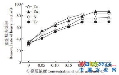 圖 8 檸檬酸濃度對(duì)剩余污泥中重金屬去除率的影響Figure 8 Effect of citric acid concentration on the removal rate of heavy metals in residual sludge