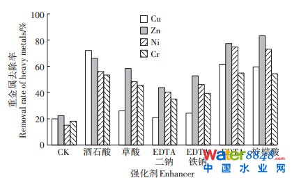 圖 4 強(qiáng)化劑對(duì)剩余污泥中重金屬去除率的影響Figure 4 Effect of enhancer on the removal rate of heavy metals in residual sludge