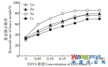 圖 7 EDTA濃度對(duì)剩余污泥中重金屬去除率的影響Figure 7 Effect of EDTA concentration on the removal rate of heavy metals in residual sludge