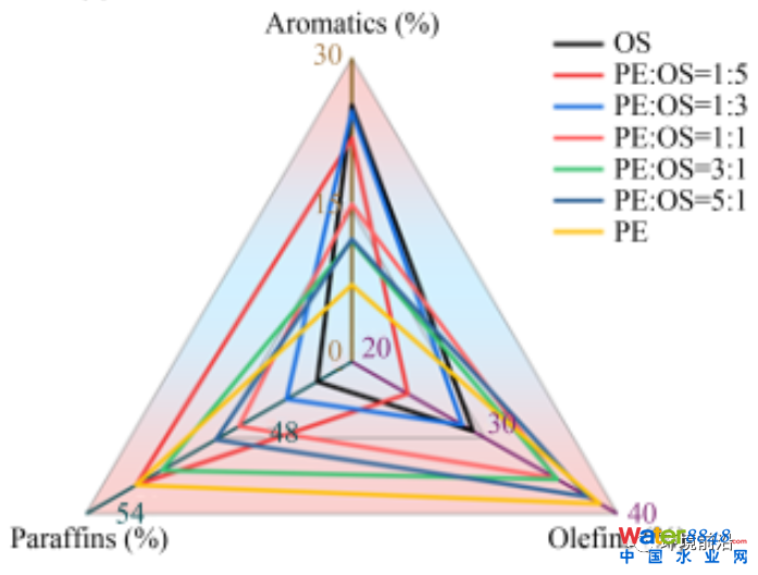 圖3 油泥、聚乙烯塑料及其混合物熱解產(chǎn)油成分 (圖中OS為油泥,PE為聚乙烯塑料)