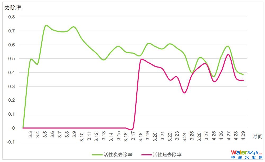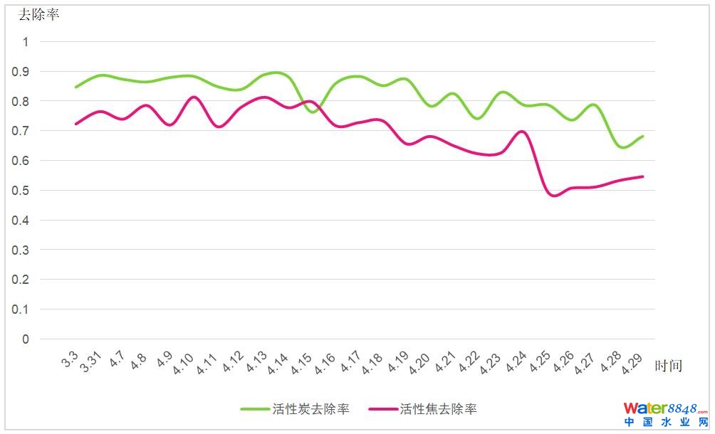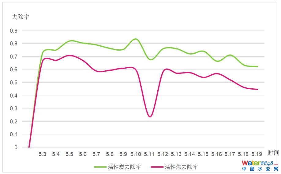 1.相同原水、相同過(guò)濾時(shí)間的條件下活性炭的出水遠(yuǎn)優(yōu)于活性焦。從數(shù)據(jù)上分析:活性炭10天后的出水去除率仍大于80%, 且10天內(nèi)出水的去除率并沒(méi)有較大變化、而活性焦的出水去除率超過(guò)50%的時(shí)間只有3天,3天后去除率呈快速下降的趨勢(shì)。