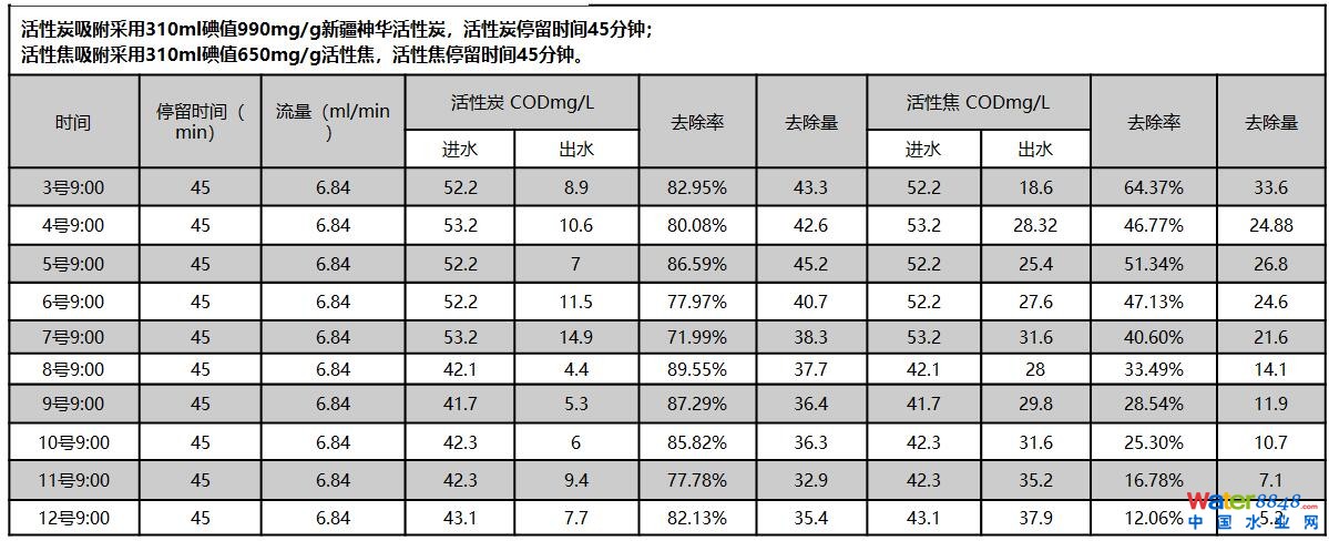 活性焦吸附采用310ml碘值650mg/g活性焦,停留時(shí)間75min。