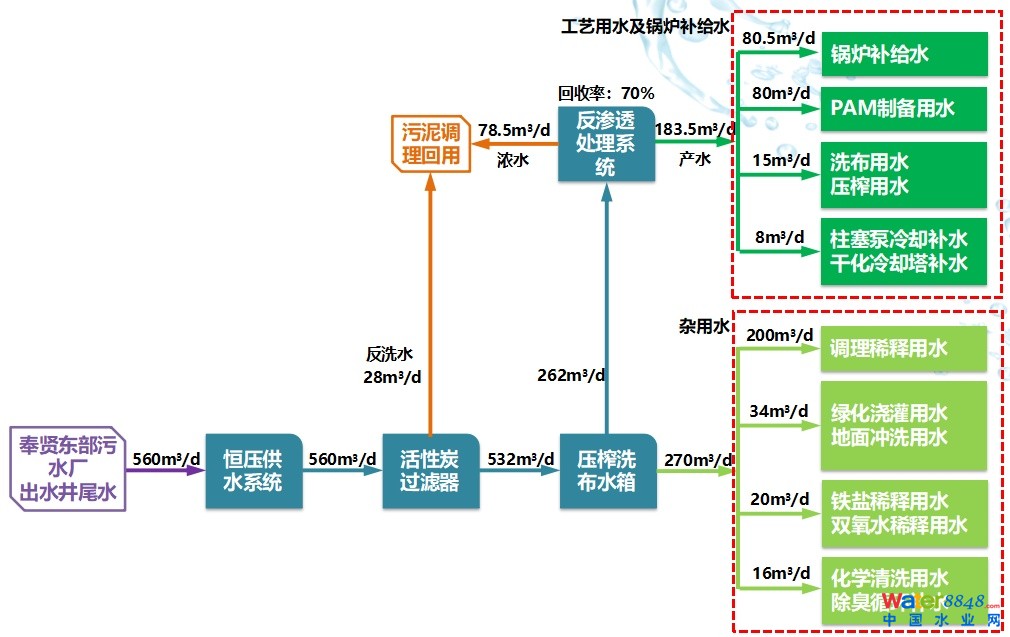 項目采用“活性炭過濾器+反滲透”主體工藝,水質(zhì)儀表在線監(jiān)控,系統(tǒng)全自動運行;赜盟到y(tǒng)產(chǎn)生的廢水可再次利用,用于污泥調(diào)理,有效避免系統(tǒng)廢水的二次污染。