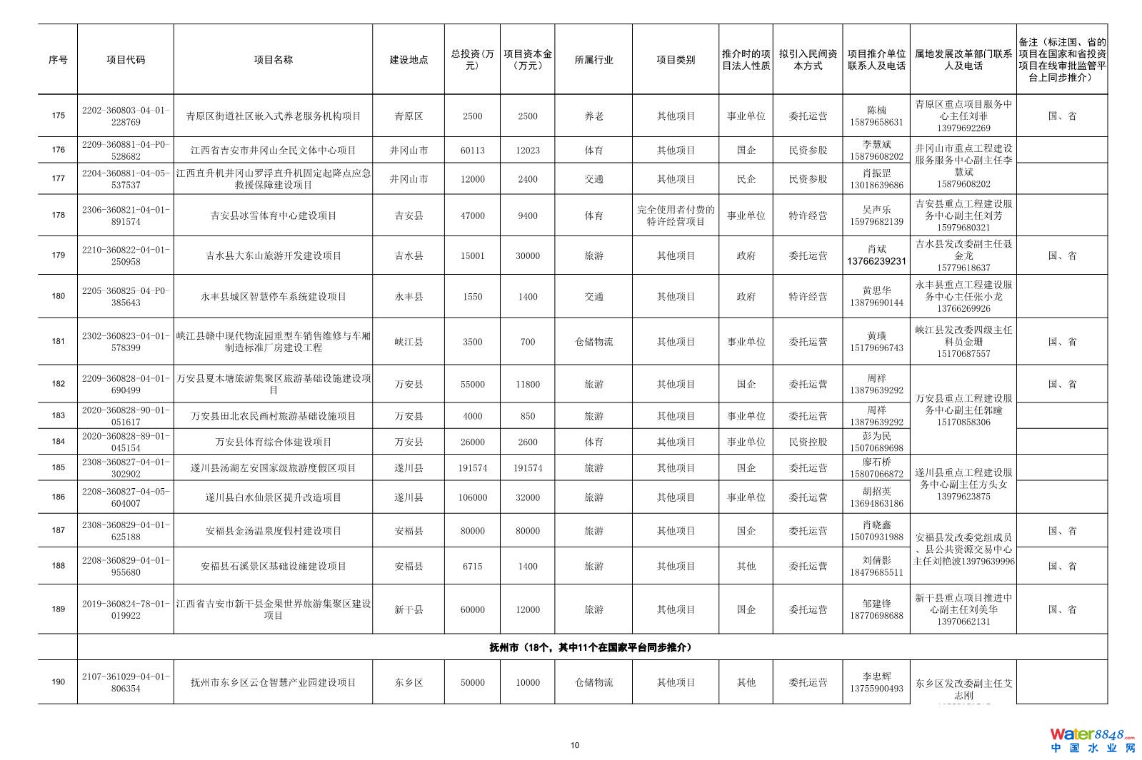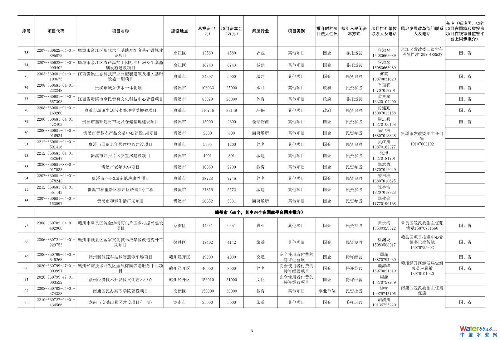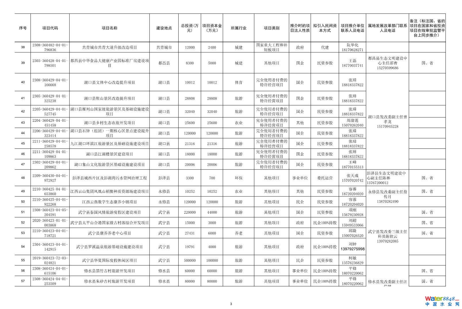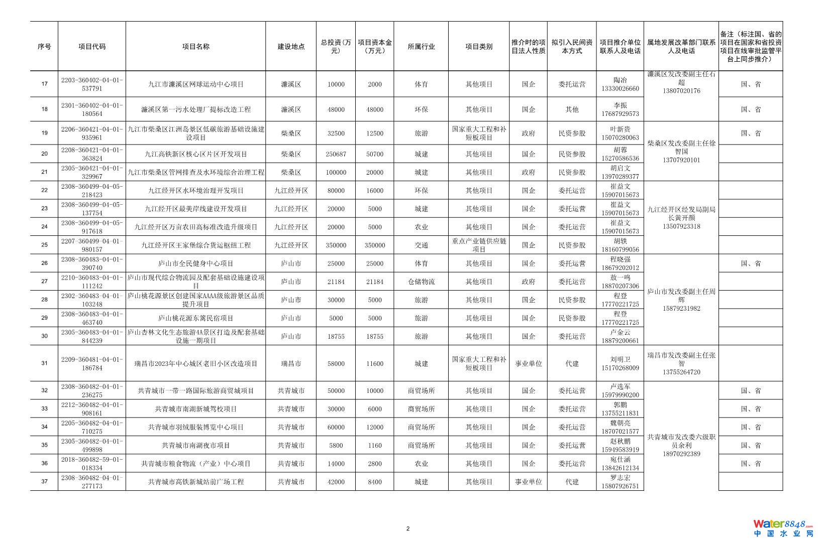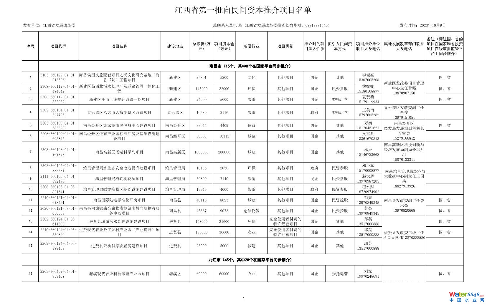 項目名單包括新建區(qū)昌西北污水處理廠及道路管網(wǎng)一體化工程、進(jìn)賢縣城鎮(zhèn)污水處理設(shè)施建設(shè)項目、濂溪區(qū)第一污水處理廠提標(biāo)改造工程、彭澤縣城西片區(qū)及彭湖灣污水管網(wǎng)治理工程、貴溪市城鎮(zhèn)生活污水處理提質(zhì)增效項目、全南縣城區(qū)鎮(zhèn)污水處理廠及管網(wǎng)建設(shè)項目、鄱陽縣蘆田片區(qū)污水處理廠提標(biāo)擴建建設(shè)項目、弋陽縣生活垃圾分類與資源綜合利用處置中心項目、灣里管理局水生態(tài)安全改造提升建設(shè)項目、九江經(jīng)開區(qū)水環(huán)境治理開發(fā)項目、江西省九江市德安縣水環(huán)境綜合治理及生態(tài)產(chǎn)品價值實現(xiàn)項目、信豐縣餐廚廢棄物處理項目等生態(tài)環(huán)保項目。