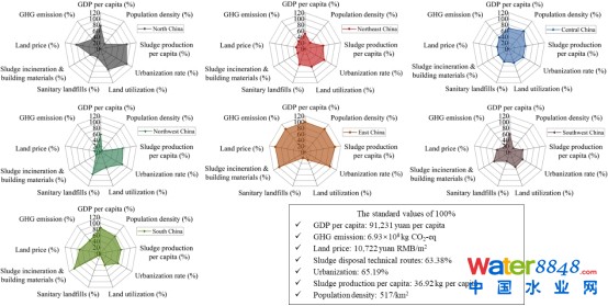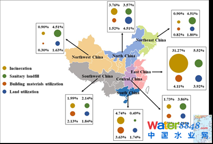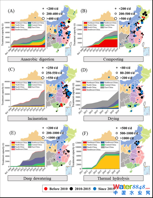 六種典型污泥處理技術(shù)在中國不同區(qū)域的地理分布及處理能力概況