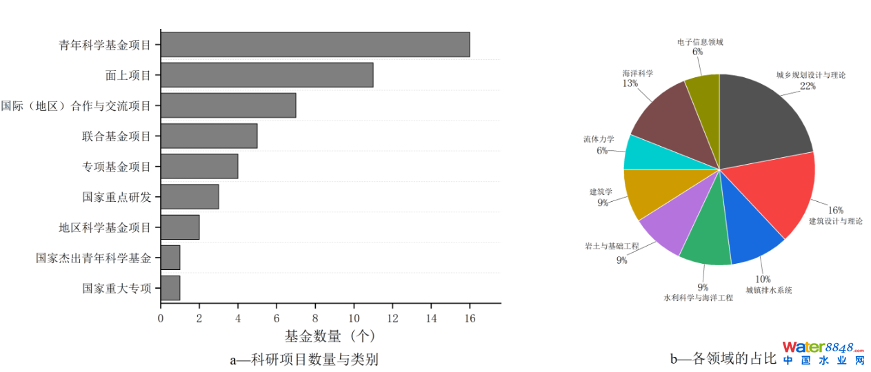 相較于歐美的數(shù)字水務(wù)注重理論和基礎(chǔ)方法創(chuàng)新,我國(guó)智慧水務(wù)科研注重技術(shù)應(yīng)用和解決實(shí)際水務(wù)問(wèn)題,例如水質(zhì)監(jiān)測(cè)和污染控制,主要以政府機(jī)構(gòu)、科研院所、大學(xué)和企業(yè)等多方合作的方式?蒲谐晒矫,如圖6所示,圍繞“智慧+水務(wù)”作為關(guān)鍵詞的國(guó)家級(jí)課題共計(jì)95個(gè),其中與城市相關(guān)的主題資助率較高。但資助領(lǐng)域交叉性強(qiáng),與水務(wù)直接相關(guān)性小,水務(wù)科研人員參與度有待提高。華北院自主研發(fā)的一體機(jī)大腦Simuwater,是國(guó)內(nèi)首款集機(jī)理模型、概化模型及人工智能于一體的混合模型,實(shí)現(xiàn)了無(wú)縫耦合流域城市排水系統(tǒng)仿真,打破了排水系統(tǒng)仿真受限于國(guó)外的瓶頸。而哈爾濱工業(yè)大學(xué)主導(dǎo)開(kāi)發(fā)的基于AI的碳排核算模型(馬頭崗污水廠項(xiàng)目),結(jié)合機(jī)理模型與數(shù)據(jù)驅(qū)動(dòng)算法,建立了生物處理過(guò)程“碳代謝”模型,發(fā)展了水處理碳排放實(shí)時(shí)計(jì)量方法,實(shí)現(xiàn)了碳排放的分鐘級(jí)別計(jì)量。博愛(ài)第二污水廠項(xiàng)目應(yīng)用數(shù)字孿生賦能污水廠低碳運(yùn)維,采用三維可視化建模,工藝仿真、自控仿真和三維可視化等技術(shù)構(gòu)建了三維虛擬水廠,整合了設(shè)備的靜態(tài)數(shù)據(jù)和運(yùn)行動(dòng)態(tài)數(shù)據(jù),實(shí)時(shí)反映現(xiàn)場(chǎng)細(xì)節(jié),實(shí)現(xiàn)水質(zhì)預(yù)測(cè)、水量預(yù)測(cè)、生化分析、物料平衡、運(yùn)行調(diào)整、設(shè)備維護(hù)、故障診斷等功能。