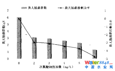 很明顯,當(dāng)余氯量保證在0.9mg/L(以有效氯計)以上時,糞大腸菌群數(shù)可以保證在200個/L以內(nèi),此時次氯酸鈉投加量約為4mg/L。消毒過程中原水中的氨氮等還原性物質(zhì)與糞大腸菌群對次氯酸鈉的利用存在一定的競爭關(guān)系,但次氯酸鈉滅活糞大腸菌起主導(dǎo)作用。