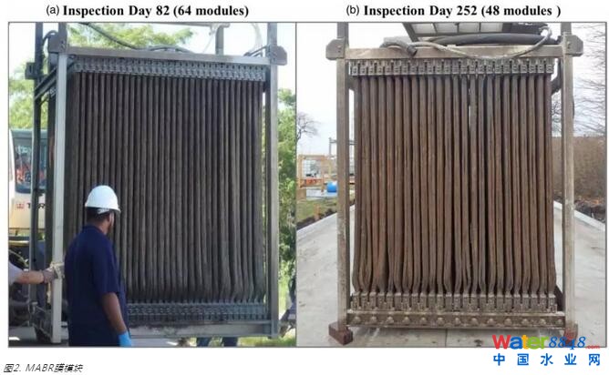 試驗(yàn)周期為296天,實(shí)際分為了兩期,如下圖所示,前145天為第一期,膜箱含有64個(gè)模塊組件,后151天為第二期,從原來(lái)的64個(gè)組件移除16個(gè),以此檢驗(yàn)?zāi)た臻g密度對(duì)運(yùn)行表現(xiàn)的影響。