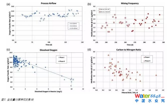 項(xiàng)目組還就曝氣量對(duì)OTR的影響進(jìn)行了測(cè)試,在第60-144天內(nèi),他們將曝氣量從4.3L/h/㎡逐步減少至3.0L/h/㎡(30%減少量),直至2.1L/h/㎡(50%減少量),然后在回升至4.3L/h/㎡。結(jié)果顯示30%的減少率并沒(méi)有明顯影響,但50%的減少量使OTR降低了20%。這是因?yàn)槌鰵庋鹾康臏p少降低了通過(guò)膜的氧氣的滲透率。圖5(b)顯示了膜箱的混合頻率對(duì)硝化速率沒(méi)有影響。圖5(c)則顯示MABR在DO低于1mg/L的時(shí)候運(yùn)作最佳。圖5(d)表明硝化速率越高,反硝化和BOD去除效果越好。