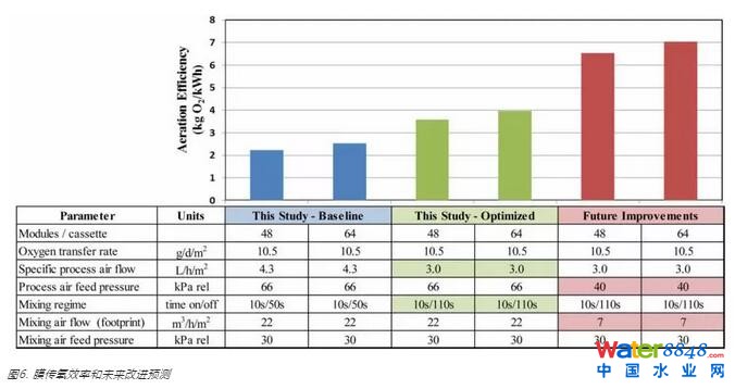 研究團(tuán)隊(duì)指出,本次測(cè)試只展示了上述優(yōu)點(diǎn)中的第三個(gè),而且也沒(méi)有得到完美體現(xiàn)。由于規(guī)模問(wèn)題,這個(gè)實(shí)驗(yàn)的曝氣是由壓縮機(jī)而不是低壓風(fēng)機(jī)時(shí)間的,所以無(wú)法直接監(jiān)測(cè)能效。另外只有一個(gè)膜箱不能充分利用間歇式的混合曝氣,這需要更多的膜箱。盡管如此,作者認(rèn)為通過(guò)圖6的曝氣效率的計(jì)算,已經(jīng)可以體現(xiàn)出MABR膜的潛在效能。