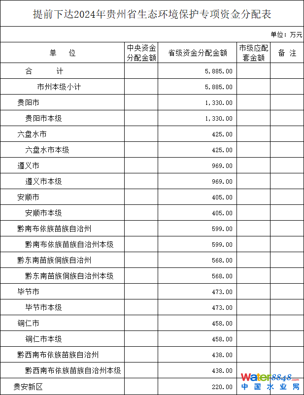 貴州省財(cái)政廳發(fā)布通知,提前下達(dá)2024年貴州省生態(tài)環(huán)境保護(hù)專項(xiàng)資金,下達(dá)資金合計(jì)5885萬元。詳情如下:
