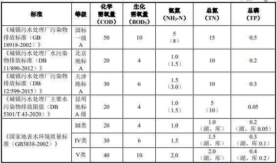 《城鎮(zhèn)污水處理廠污染物排放標(biāo)準(zhǔn)(GB18918-2002)》的最高標(biāo)準(zhǔn)即一級(jí) A標(biāo)準(zhǔn)中,其主要指標(biāo)的排放要求均低于(或等于)地表水 V 類標(biāo)準(zhǔn),總體屬于劣 V 類水質(zhì)。近年來,為促進(jìn)景觀河湖水體的水質(zhì)提升,推動(dòng)流域生態(tài)環(huán)境的持續(xù)改善,部分城市或地區(qū)先后制定并執(zhí)行了更為嚴(yán)格的污水處理廠污染物排放地方標(biāo)準(zhǔn),進(jìn)一步拉動(dòng)污水處理廠提標(biāo)改造的市場(chǎng)需求。以北京、天津、昆明為例,上述地區(qū)執(zhí)行的污水處理廠污染物排放的地方標(biāo)準(zhǔn)與國(guó)家標(biāo)準(zhǔn)以及地表水環(huán)境質(zhì)量標(biāo)準(zhǔn)的對(duì)比如下表所示: