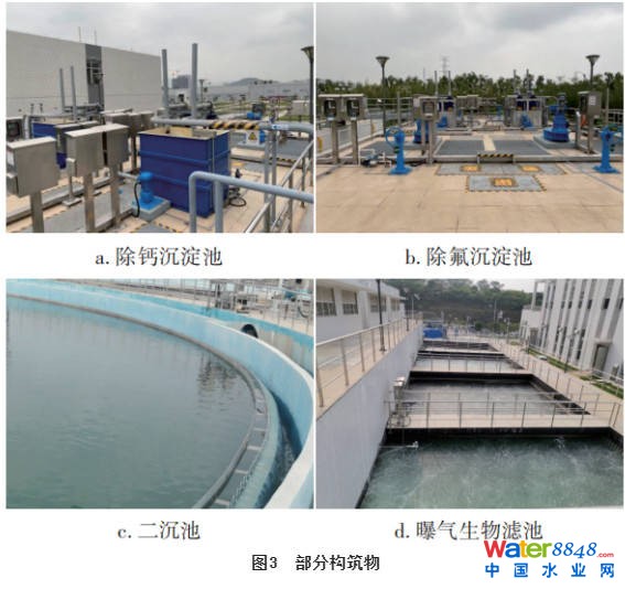 3.1工程進(jìn)度及現(xiàn)場(chǎng)圖片該工程于2018年11月開(kāi)始施工,2020年2月底通過(guò)竣工驗(yàn)收,2020年11月通過(guò)環(huán)保驗(yàn)收,目前一直運(yùn)行穩(wěn)定,最終尾水水質(zhì)優(yōu)于地表水Ⅳ類(lèi)標(biāo)準(zhǔn)。部分現(xiàn)場(chǎng)構(gòu)筑物照片見(jiàn)圖3。