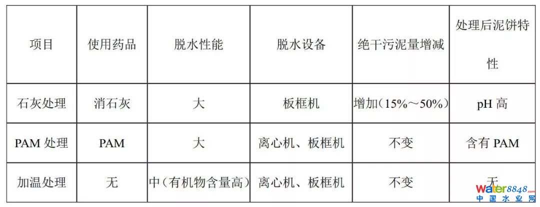 減少污泥濃縮脫水藥劑投加量,濃縮污泥、脫水污泥須采用濃縮前處理(高分子凝聚劑、熱處理等)、脫水前處理(石灰處理、凝聚處理、污泥加溫處理或膜濃縮處理)方式提高處理效果,脫水預處理效果見表1,添加石灰雖然可使污泥脫水性提高,但會增加絕干污泥量15%50%,且污泥堿度高,不利于污泥后續(xù)處置,一般較少采用。